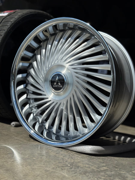 24” ARTIS JUICY BRUSHED CROME LIP DAUL DRILLED (5X120 5x127) STAGGERED FOR GMC YUKON CHEVY SUBURBAN SIERRA 1500 C10 TAHOE BOX DONK CAPRICE IMPALA CAMARO CHEVELLE CUTLASS MONTE CARLO